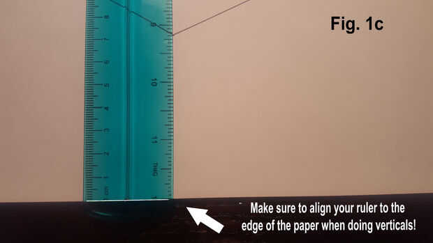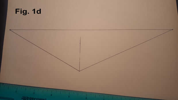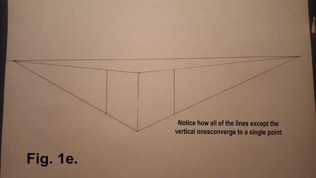 1.3 dibuje dos líneas diagonales, uno que se extiende desde cada punto de fuga, que convergen cerca del centro de su papel. Asegurando que el gobernante es recto en el borde del papel, dibuje una línea vertical única donde convergen las dos líneas. (Fig. 1c)