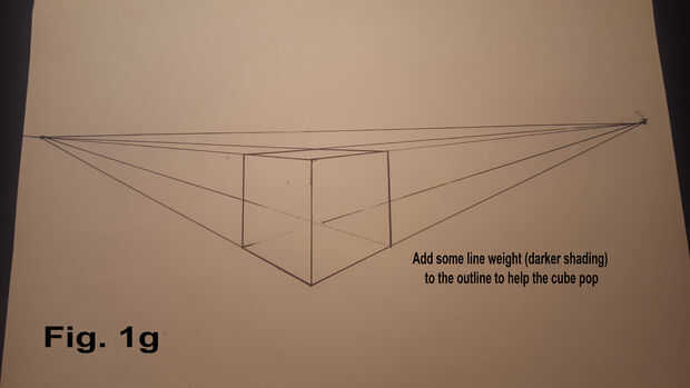 1.5 una vez que estés satisfecho, dibuje dos líneas verticales más para establecer dónde poner fin a los lados de tu cubo. (Fig. 1e)