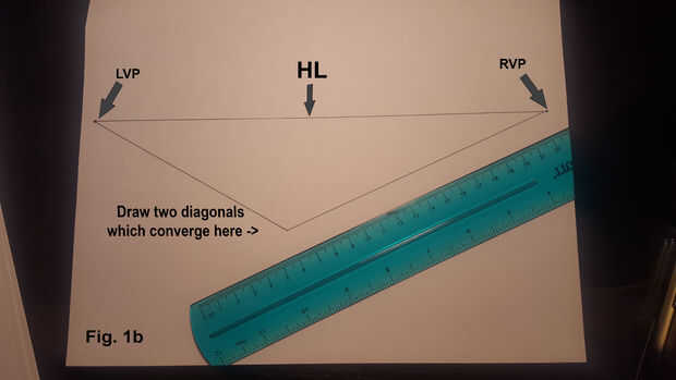 1.2 los extremos de la línea se llaman el "punto de fuga izquierdo" (LVP) y derecho de punto de fuga (RVP) respectivamente. Se llaman así porque son los puntos en que cosas se desvanece en el horizonte. Éstos son también los dos puntos titular; nuestra perspectiva todo se basa en estos dos puntos pequeños. (Fig. 1b)