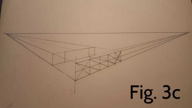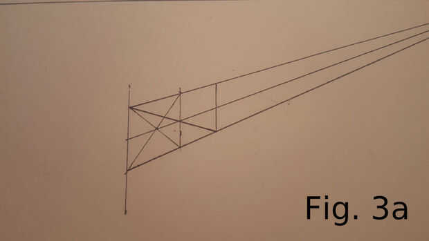 3.1 extender una línea diagonal desde la esquina superior izquierda de tu base, a través del extremo derecho del punto medio de la rueda, hasta llegar a la primera diagonal que trazaste la rueda. Una vez que lo ha hecho, trace una línea vertical desde ese punto hasta la diagonal superior. Si se hace correctamente, con precisión habrá replicado un cuadrado en perspectiva. Asegúrese de que usted busca en la figura 3a dirección.