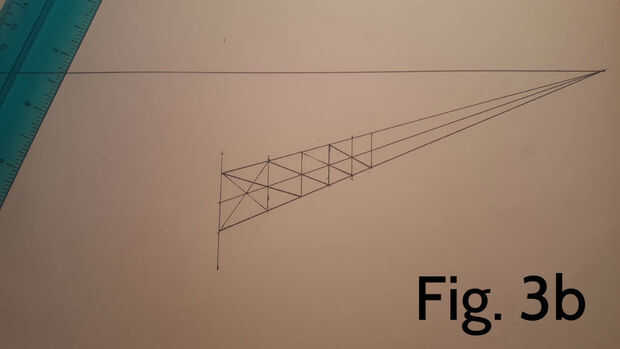 3.2 Repita el paso 1 tres veces más, creando cuatro subdivisiones. El inciso cuarto es donde su neumático trasero se dibujarán más adelante. Llenan en el apartado cuarto de la "X" demostrada en el paso 2.6. Nota que el centro de esta "X" debe estar en la línea dibujó en el paso 2.7 (Fig. 3b)