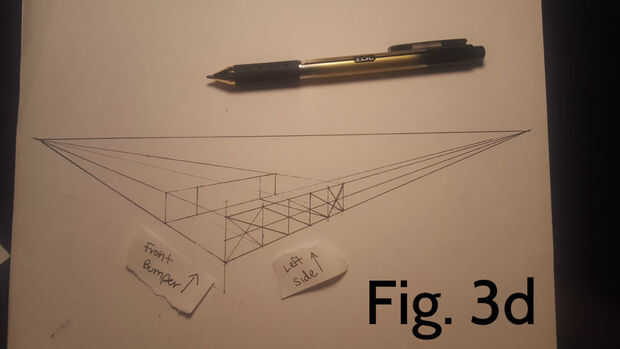 3.4 Figura 3d Muestra lo que estamos trabajando para. Las diagonales del LVP frente a la anchura de la carretilla, el frente más diagonal correspondiente con lo que más tarde se convertirá en el parachoques, y las diagonales que se extienden desde la RVP tratan con longitud del vehículo, en este caso.