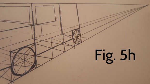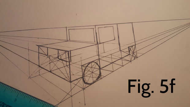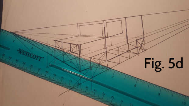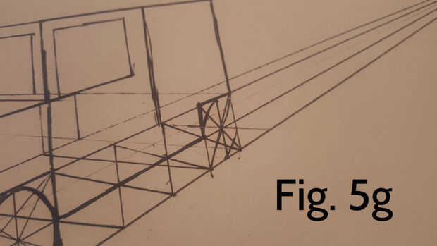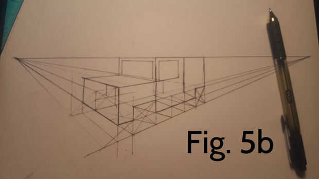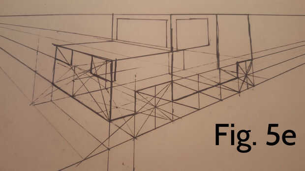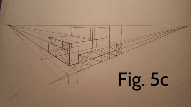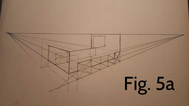 5.1 dibujar la campana, añadir una ventana para ver cómo cabrá. Asegúrese de seguir las reglas de la perspectiva que has estado practicando; Asegúrese de que las verticales son exactamente 90 grados usando la regla y el borde de la página y asegúrese de que las diagonales corresponden a los puntos de fuga. (Fig. 5a)