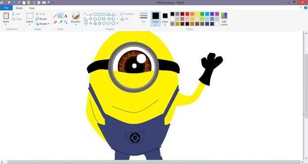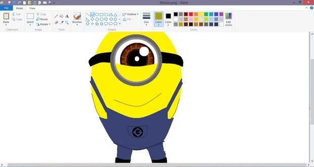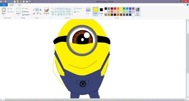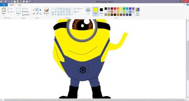 Now, to make the arms... Tomar el mismo amarillo que usaste para hacer la boca y hacer una línea (o entre ambas manos detrás de la espalda) a lado de su cuerpo como se muestra en la imagen. Hice este súbdito tiene un brazo saludando y que detrás de su espalda... ocultar algo. Ahora, en el lado que desea que su mano detrás de su espalda (o a su lado), hacer una línea con curvas amarilla que llega desde la parte superior de sus guardapolvos a mitad de camino bajando por el lado de la parte inferior de su mameluco (para su mano detrás de su espalda). Esto le indicará su brazo... detrás de su espalda. Ahora rellenar con amarillo. Su brazo saludando, hacer dos líneas curvas que salen de la parte superior de sus guardapolvos y hacen por lo que parecen en la foto. Rellene y haga sus guantes utilizando su referencia súbdito.