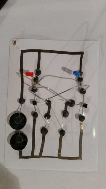 Dio un esfuerzo heroico, pero sus habilidades eran un poco oxidados, y teníamos todos los componentes exactos (puede ver su intento, con el rojo y azul LED). Así que ahora he asumido el reto y he dibujado mi flip-flop con Conductak, Magic marcador de tinta conductiva y pegatinas de circuito!