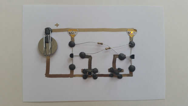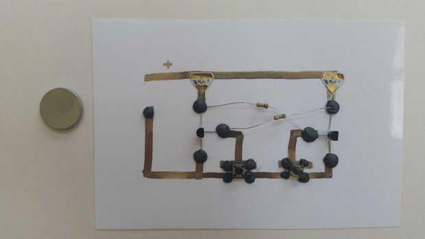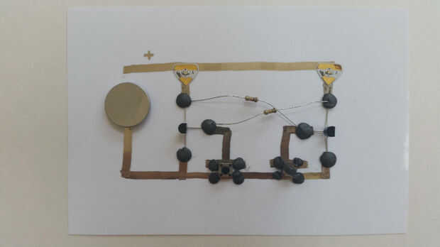 Pegar un poco de Conductak a la traza del terreno y pegan su batería de botón abajo. Completan el circuito con más Conductak y un clip para conectar el lado positivo de la batería al rastro positivo. Cuando el flip-flop se enciende, el universo decidirá el estado inicial para usted.