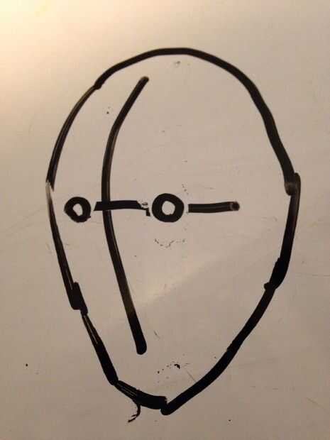 dibujar un óvalodibujar una forma transversal en toda la cara, una línea vertical y una línea horizontaldibujar círculos para los ojos en medio de la caraPaso 1: Ojos y narizhacer una pupila en la esquina de su ojo, añadir un círculo blanco para most