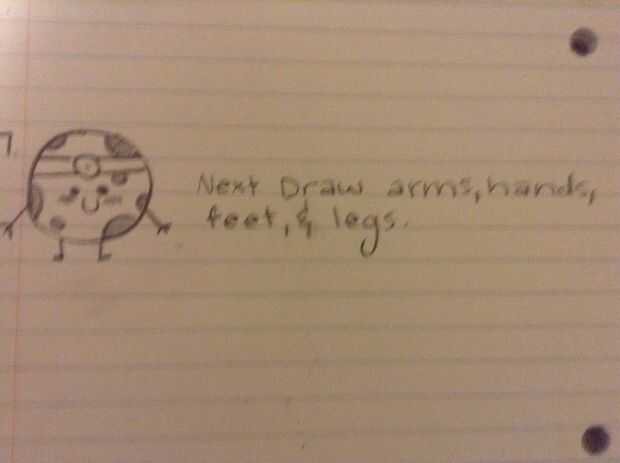 a continuación dibujar brazos pequeños a cada lado de él (o ella) y dibujar las piernas poco debajo de él (o ella).
