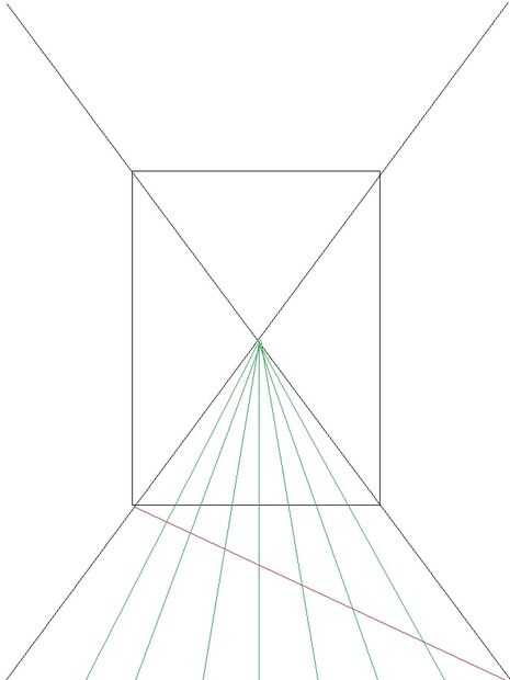 Paso 4: a continuación, usando el lápiz y la regla, marque ligeramente líneas oblicuas desde el centro de la X (llamado el punto de fuga) al frente de la planta que se encuentra en la parte inferior del papel. Estas líneas de baldosas, por lo que usted les puede espacio como quiere... también podría ser tableros para un suelo de madera.