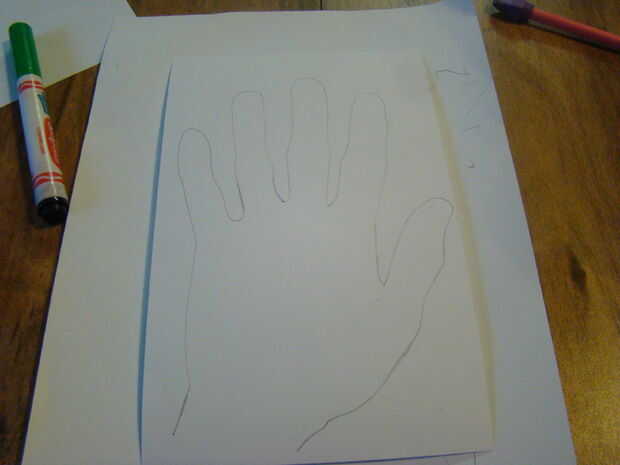 Un pedazo de papel de desecho bajo la impresión de la mano para proteger la superficie se dibuja en.