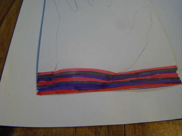 Elegir en qué orden quieres poner los colores, empezar a dibujar a lo ancho del papel.  Tienen el color siguiente justo en la parte superior del color antes de él.  Cuando finalmente llegue a la línea del dibujo de la mano, curva de la línea un poco hacia arriba en un arco suave, terminando en el otro lado de la línea de la mano en el mismo nivel que usted comenzó.    Seguir añadiendo la curva cada vez que vengas a una línea de impresión de mano.