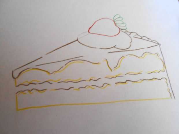 Utilice el lápiz marrón oscuro para delinear la guinda en la parte superior y entre las capas del pastel. (Foto 1)