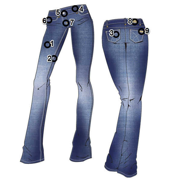 El botón principal del Metal en la correa de cintura se llama una caña en los pantalones vaqueros del dril de algodón. 6. remache A remache es un recorte pequeño de metal y coloca en la esquina de los bolsillos. Para evitar que se desgarra, cuando se aplica fuerza durante el uso.