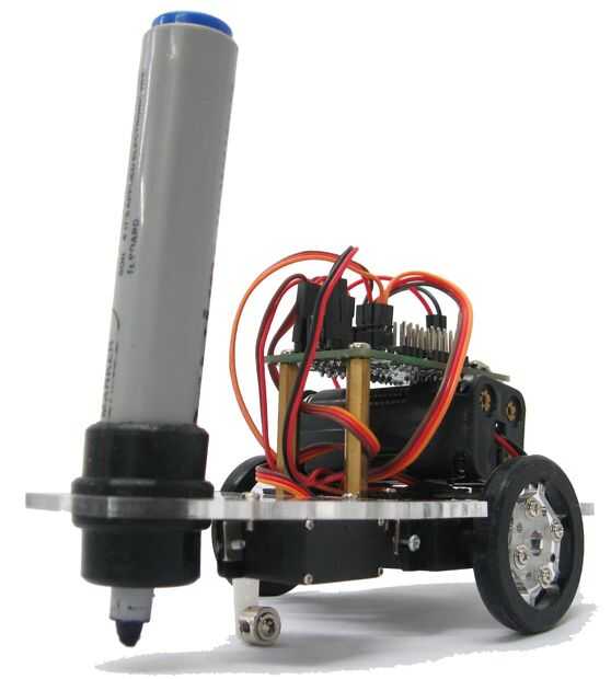 Bot de Doodle es una plataforma robótica simple que es ideal para el aficionado a los hobbys y los estudiantes aprender los conceptos básicos de locomoción del robot. El robot tiene 2 motorreductores para locomoción y 1 servo para subir o bajar la pluma. Los únicos sensores de robots son dos codificadores de rueda simple que pueden utilizarse para medir la distancia o la velocidad. Cerebro del Doodle Bot es un pequeño, bajo costo, controlador compatible con USB interfaz, cabeceras de servos y controladores de motor todos construido en Arduino.
