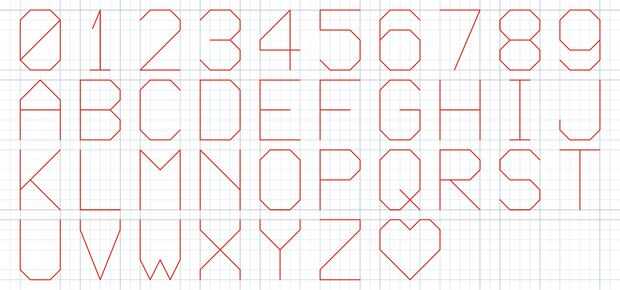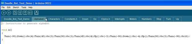 Si usted mira el código de la letra "A" y compararlo con el mapa de caracteres anterior, verá que después de dibujar la carta el robot levanta la pluma, va hasta el fondo del personaje y luego va pasos derecha 6.