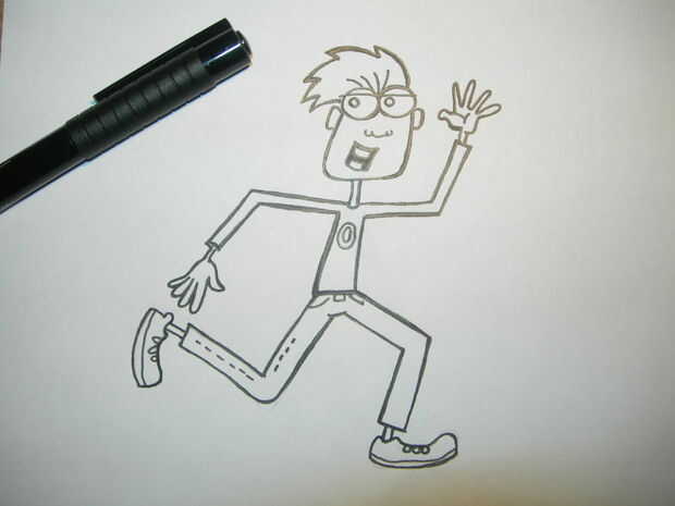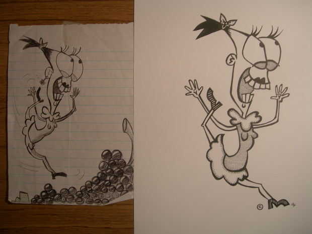 El otro video te muestra cómo terminar el dibujo con tinta. (una pluma con tinta resistente al agua funciona muy bien). Observe cómo utilizar este tiempo para "ignorar" los errores de hecho a lápiz sobre el doodle con la pluma y no sigue el mismo error con tinta. El mejor ejemplo es en la rodilla de la pierna izquierda del personaje (a la izquierda de nuestro punto de vista).