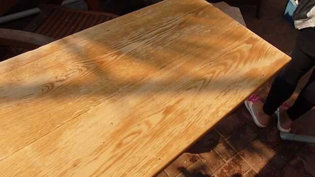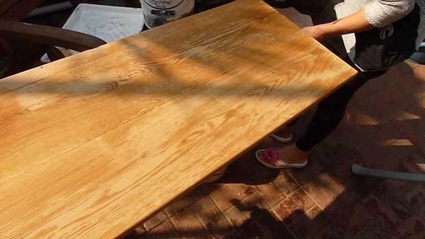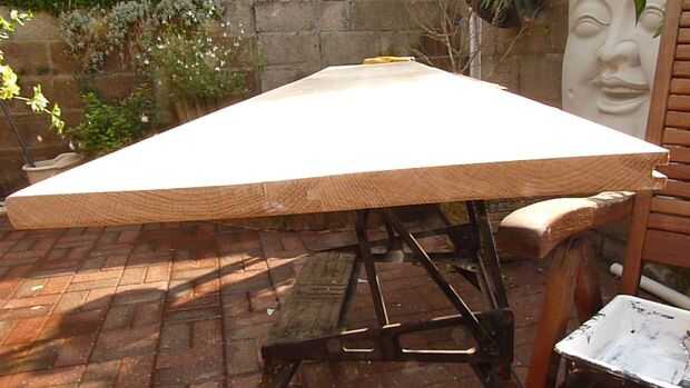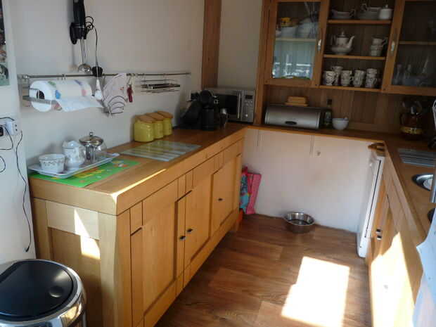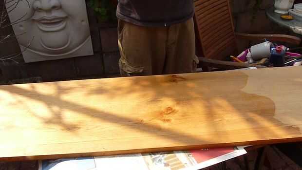 22 mm de sólido roble de pinotea con ranuras machihembrado hacer tablones amplia excelentes pegada y afianzado con abrazadera juntos. He utilizado tablones normales claro pegamento para madera para fijar juntos. Una vez secos estos se lija con una lijadora orbital grande y un avión de madera fue utilizado para quitar la lengüeta de la parte frontal de la nueva superficie de trabajo. Luego fue cortada para caber entre las nuevas unidades de cocina y la pared posterior, apoyado con madera ángulo como con la encimera previamente.