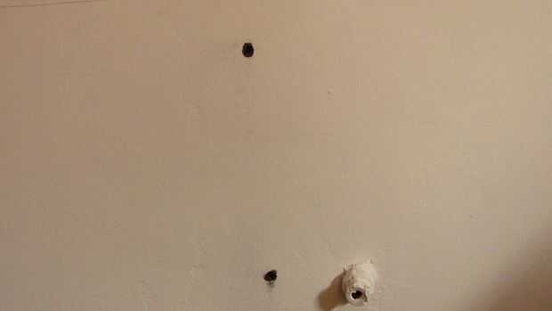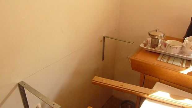 Fuertes escuadras galvanizados estriados se fija a la pared para tomar la plataforma / superficie de trabajo, que también dependía de la madera ángulo que fue asegurada a las nuevas unidades de la cocina para producir una superficie rasante y la vitrina fue apoyada en ambos extremos y en el centro de los soportes.