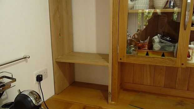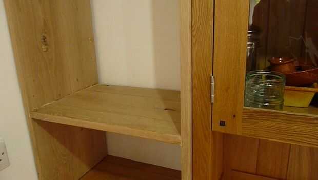 Para hacer más funcional la vitrina y mejorar su aspecto, un armario pequeño de alimentos fue realizado utilizando el mismo 22mm lengua y bosque de roble de pinotea. Las juntas fueron atornilladas y pegan con pegamento del gorila y los estantes de vidrio de la unidad de edad fueron rescatados junto con los insertos que soportan los estantes. (Los bits sólo es útiles desde la antigua cocina)