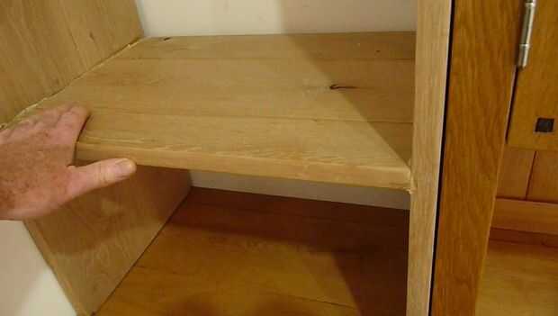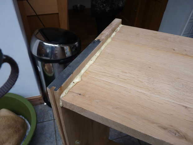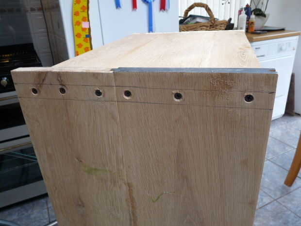 Los agujeros fueron perforados para tener los soportes de relleno y la superficie de trabajo roble y armario nuevo fueron teñidas con té fuerte y cubierto con cera para muebles varias veces asegurándose de que ambos lados fueron totalmente cubiertos para impedir la deformación de madera.;