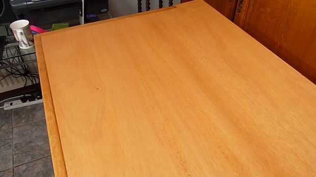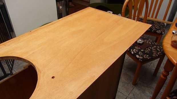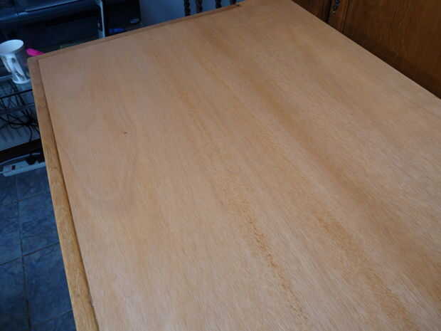 La nueva tapa de madera contrachapada, que tiene una madera dura a ambos lados de la superficie fue teñida con té fuerte, 4-5 capas y salí a secar antes de ser sellada con barniz mate poliuretano resistente en el bajo lateral teniendo cuidado de no tener ningún barniz en la superficie superior. Esto fue permitido secar por un día.
