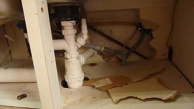 La parte superior de madera contrachapada exterior nuevo fue cortada para ampliar la unidad que la unidad de lavado con el lavavajillas y ocultar todas las tuberías y tuberías detrás de él y no dentro de la unidad de cocina como fue el caso con la vieja cocina.