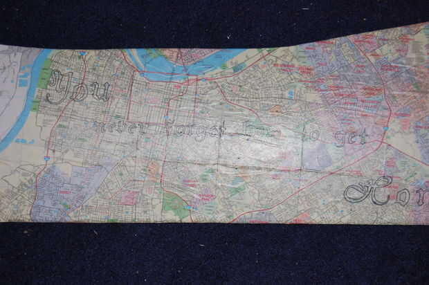 Después de cura de la fibra de vidrio, hacerlo con él quiera. Una vez más, quería que el tema de esta junta que transporte por lo que para la cubierta, tomé un mapa de Louisville y Modpodged en entonces tomó una clara capa de spray a todo para sellarlo pulg. y hacen es resistente al agua. Aparte de buscar grandes, puedo usar el mapa para encontrar nuevas colinas para comprobar hacia fuera de hablar con la gente.