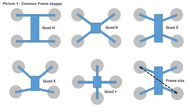 Aquí están las más comunes formas de marco de quadcopters, usted puede diseñar su zumbido a partir de uno de ellos, o usted puede ir creativo :)