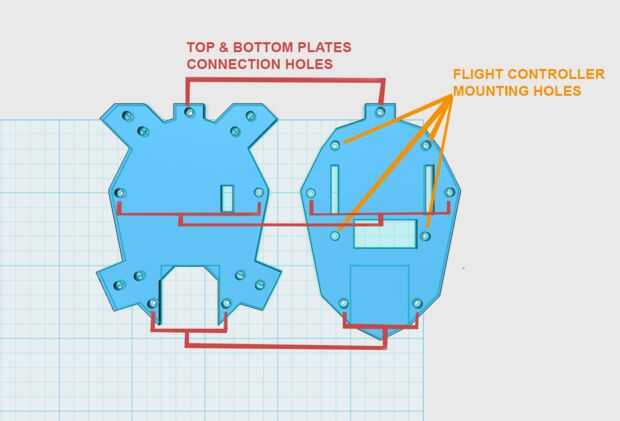 - Zona de cámara FPV (opcional): Si usted quiere equipar su drone con una cámara FPV (más divertida manera de volar), desea mantener un área específica (y ventana) en su marco, sobre todo desde la cámara FPV un orientado para mirar hacia arriba, sería inconveniente si la cámara está mirando la placa superior.