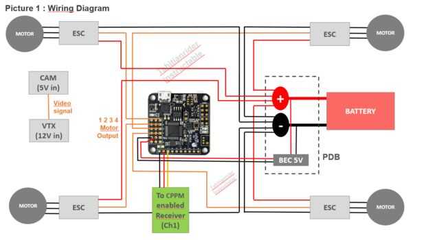 -Señal ESC 4 señal de salida motor 1 2 3 4 de controladora de vuelo. El orden de los motores va a depender de su controlador de vuelo, un motor diagrama número estarán disponible en el software de su FC (Openpilot, Cleanflight etc...)
