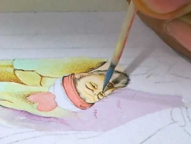 La cantidad de color de principio se utiliza para la cara el brillo o la oscuridad de la cara. Colores de principio de este trabajo son blanco, rojo y mostaza. También puede añadir café o no. Depende del caracter que desea trabajar en él. Recordar al tema en el artículo anterior que expliqué en Aguada, cuando haces un color cuando seca sería más oscuro. También puede probar en un papel o cartón antes de usarlo en el dibujo principal y esperar a secar el papel, después de que le gusta el resultado, empezar a pintar el dibujo principal. (Figura 20)