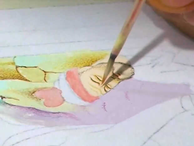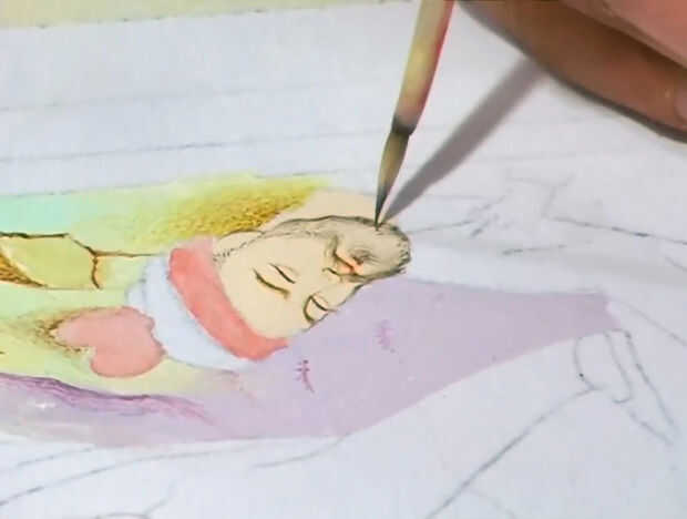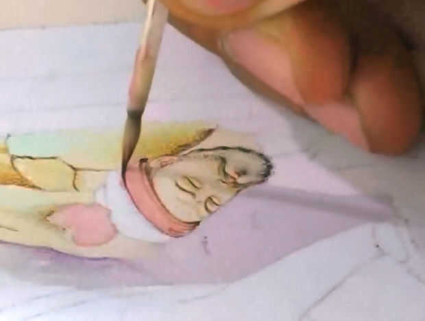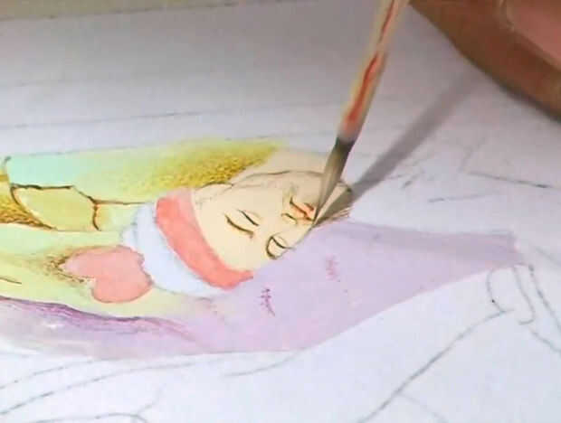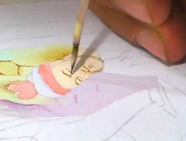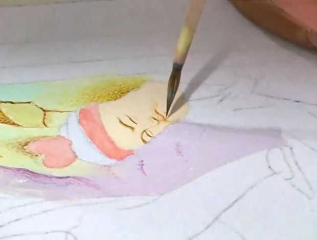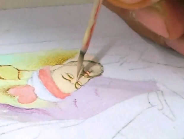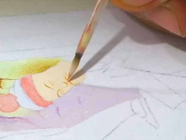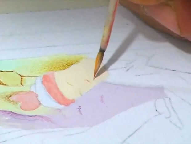 Trabajo con el pincel más pequeño. Cuando el color se seca y entendimos que este color es el color que tenemos, empezamos a colorear. Pintura y esperar a que seque. Después de se seque, comenzamos a pardaz. Empezamos el trabajo en la cara por pincel. Después de bajo color puede trabajar con el lápiz de dibujo de la cara muy débilmente hasta el bajo color no destruir. Con un tenue color definimos partes de la cara. Hacemos esta parte muy débilmente. (Figura 21)