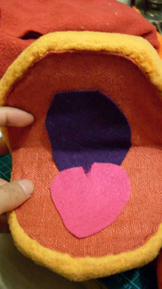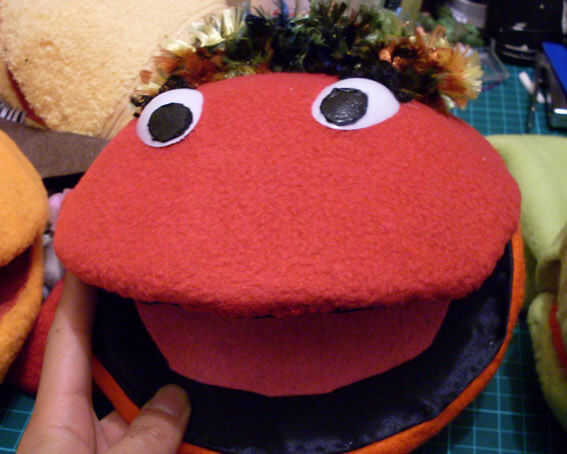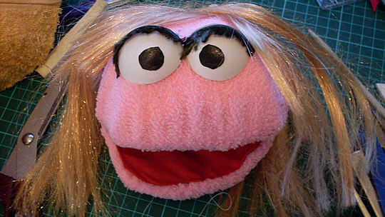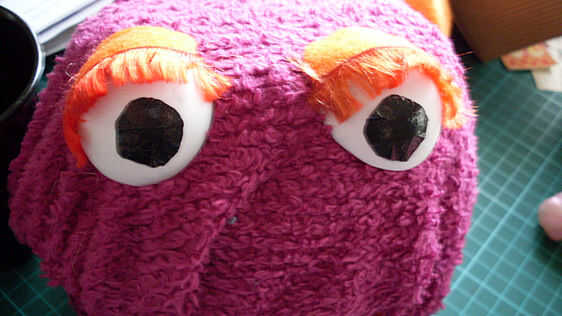 Las pestañas son de lana con volados negro. Los párpados de la marioneta de edredón magenta cabeza está hecha de fieltro naranja corte en una media luna y pegan a la parte posterior de la pelotita de ping pong.