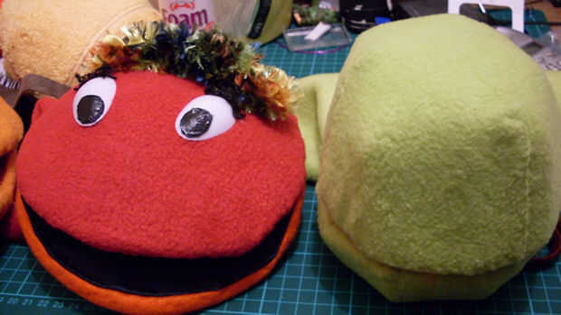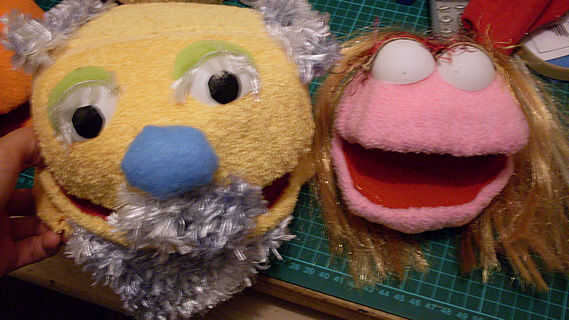 En otras marionetas he usado pelotas de ping pong en rodajas por la mitad. Entonces derramó un poco espuma / pva pegamento dentro y deja para secar durante la noche. La nariz es un poco de fieltro cosida sobre bolas de esponja.