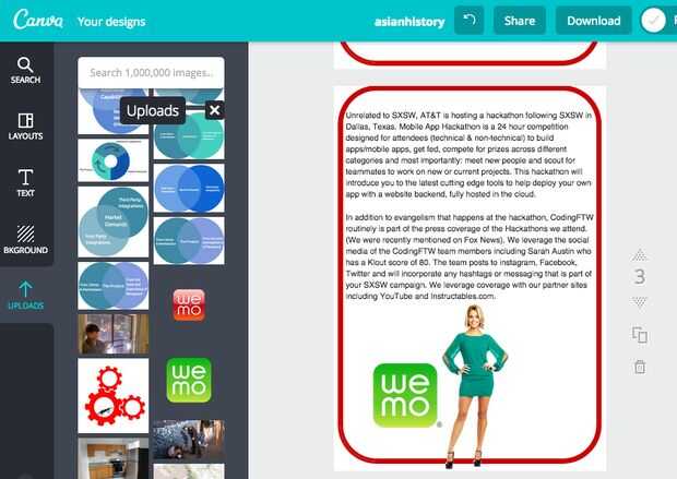 Utilice la opción de subir para personalizar su informe. Usted puede agregar sus propios gráficos para que coincida con lo que se trata el contenido de su informe. Si el informe es acerca de un libro entonces tratar de encontrar gráficos para subir que coincidan con el contenido del libro, pero específicamente para que coincida con las palabras en la página que se están agregando gráficos demasiado. Si usted tiene un gráfico que es demasiado grande, es perfectamente común que una página del informe ser sólo texto y la siguiente página una imagen que tiene la página entera. Con las imágenes de 12 millones en Canva, estoy seguro que usted no tiene un tiempo difícil encontrar algo que coincida con lo que usted está buscando.