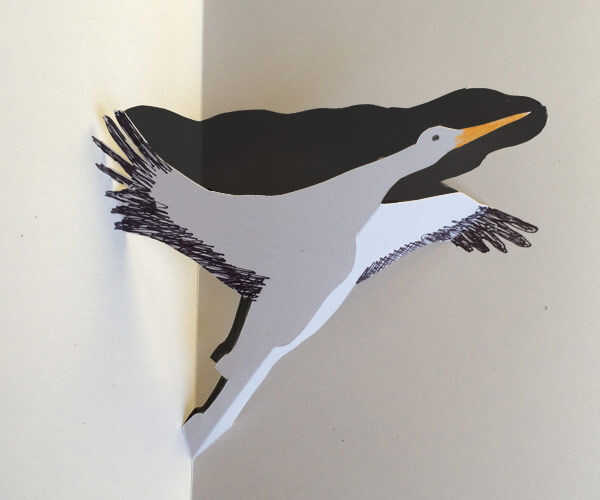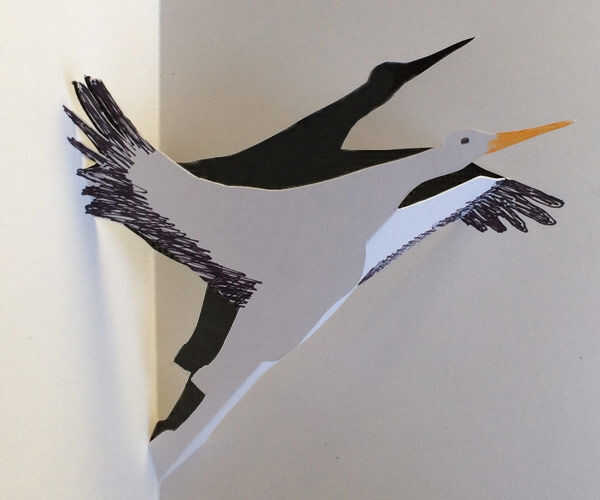 En algunos casos cortar el papel extra elimina una forma de distracción, como se puede ver en la cigüeña emergente. Sin la nube puede ve y reconoce la forma del pico, que da la cigüeña una sombra extraña. Añadir una nube en el cielo y solo ves la cigüeña.