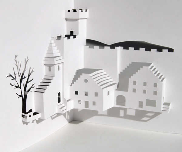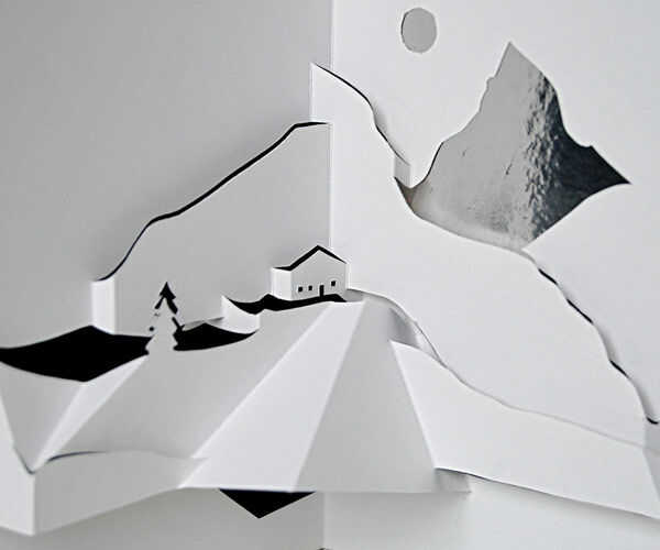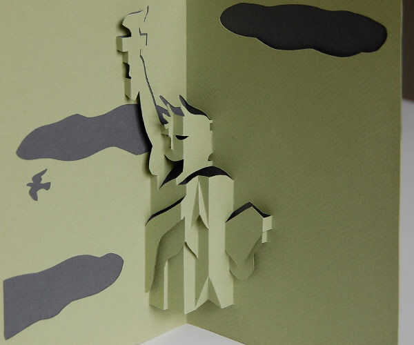 Mientras tienes el cuchillo hacia fuera así puede hacer unos cortes adicionales: la aldea y en la foto de la Estatua de la libertad tienen recortes adicionales que contribuyen a la sensación de profundidad y espacio. En una de mis cartas favoritas, el Matterhorn es apenas una silueta de corte, con sólo las colinas de primer plano saliendo de la página. Por supuesto, también, puede obtener un efecto similar mediante la elaboración de gráficos, pero hay algo muy especial acerca de una imagen hecha de una sola hoja de papel sin tinta visible.