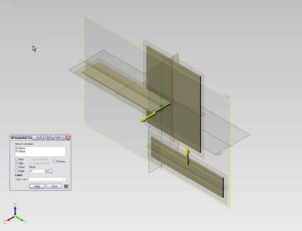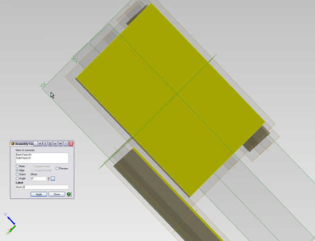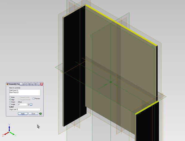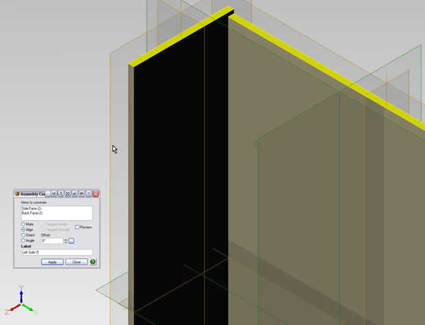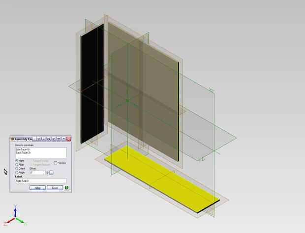 Seleccione el icono del conjunto restricción y restringir los lados con lo que hoy es el plano de referencia horizontal de las piezas al plano XY. Imagen 2. Entonces restringir la cara superior hasta el borde estrecho de la parte posterior. Hacer esto para cada lado, y debe tener dos lados verticalmente de pie. Imagen 3.