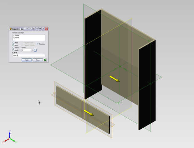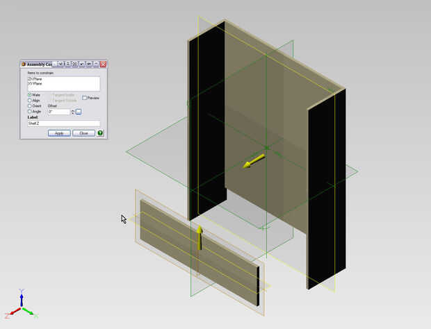 Utilice el botón Insertar parte/subconjunto en la esquina superior derecha y seleccionar la plataforma. Después de insertar, gire en la geometría de referencia y el cuadro de diálogo restricción para restringir el plano corre verticalmente en el centro al plano YZ. Aquella que utilizamos para la parte posterior del centro. A continuación seleccione en la cara de la plataforma y limitar con un mate en el borde inferior de la espalda. Debe darle la vuelta alrededor por lo que ahora es plana, y basta con restringir el borde posterior de la repisa en la parte frontal de la parte posterior. Una vez que la plataforma esté en su lugar podemos utilizar para hacer duplicados. Imagen1 y 2.