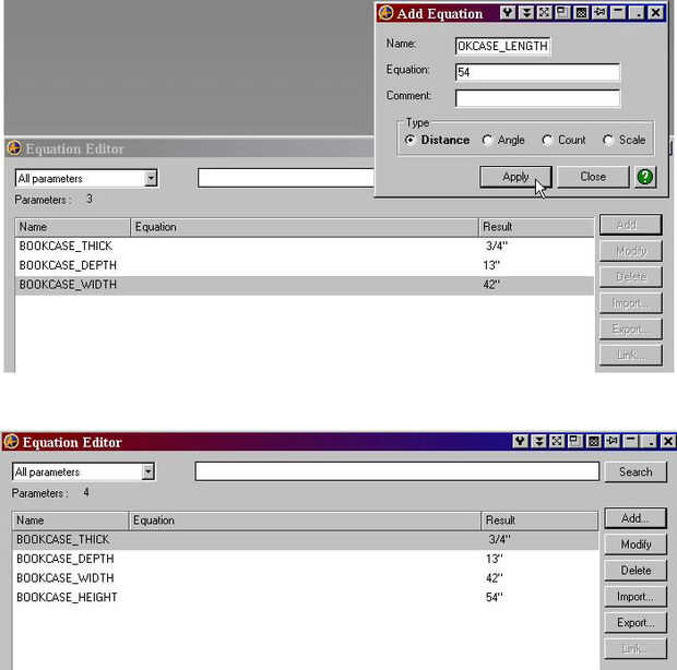Abra el Editor de ecuaciones y seleccione el botón Agregar para agregar manualmente parámetros al Editor de ecuaciones. Introduzca BOOKCASE_HEIGHT en el nombre del parámetro y 54" para el valor de la ecuación; BOOKCASE_WIDTH y 42" por la amplitud, er... Ancho; BOOKCASE_DEPTH y 13" de profundidad; y BOOKCASE_THICK y 3/4" de espesor de las piezas componentes de la librería. Sólo necesitamos añadir BOOKCASE_TOEHEIGHT y 3" para definir la altura del zócalo debajo del estante inferior. Con estos 5 parámetros que definen las condiciones generales de diseño de la librería, ahora tenemos toda la información que necesitamos crear ecuaciones que especifican el tamaño de cada parte.