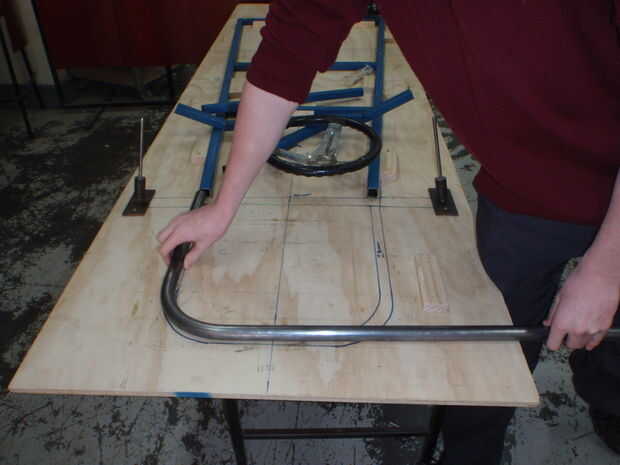 Hemos utilizado tubo de 25mm OD para el frente y parachoques traseros y 19 mm OD para los primeros parachoques montaje, montaje, soportes de columna columna y volante de dirección del asiento. Usando un doblador de tubo puede ser un poco complicado, hay que recordar que cada curva tiene un principio y un final y utiliza el material como usted lo doble. Así que es una buena Idea retirar la matriz de la máquina y póngala en su plantilla para darte una mejor idea de donde se pone el tubo después está doblado. También cortar el tubo más de lo que crees que necesita como siempre puede cortar un poco de cada extremo para conseguir que se ajuste.