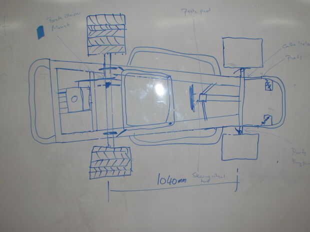 - Tan pocas cosas a considerar, primera vía y la base de la rueda deban ser aproximadamente igual a la de un kart de carrera, base de la rueda así 1040mm, y alrededor de 680mm entre el rey de los pernos. Esto nos dará el mejor manejo de kart, kart de carrera la mayoría están bastante cerca de ese tamaño.