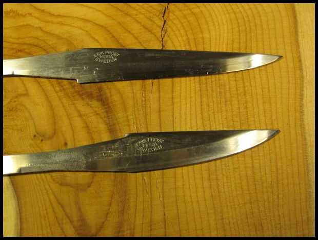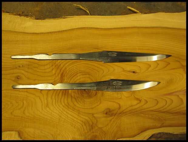 Por supuesto que necesita un buen knifeblade, me gustan los de Mora de las heladas. Son baratos y muy afiladas. Los utilizo en este instructable son KB120 y KB106. Son hojas laminadas con un centro muy duro y hierro a los lados. Hacer el borde durable sin hacer la hoja frágil.