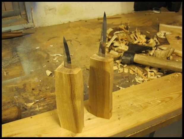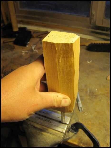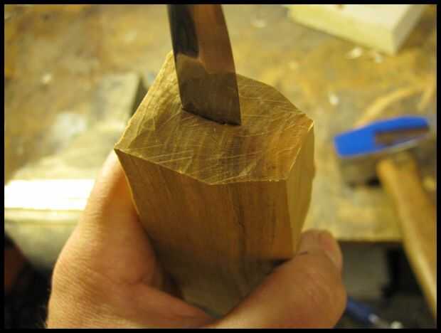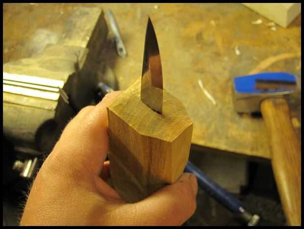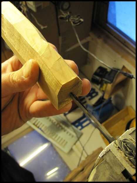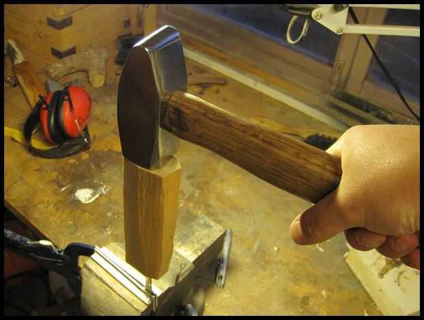 Lugar ahora la manija sobre la espiga y con movimientos firmes y controlados unidad la espiga en el mango. Todo el tiempo necesita para asegurarse que el gos de tang en el mango. Cuando la espiga no a larga en el mango que son capaces de corregir el ángulo. Pero luego se torna más profundo se ha quedado atascado. Si la hoja se pone en mal allí son observando otra cosa para hacer que fractura el mango, eliminarlo y empezar.