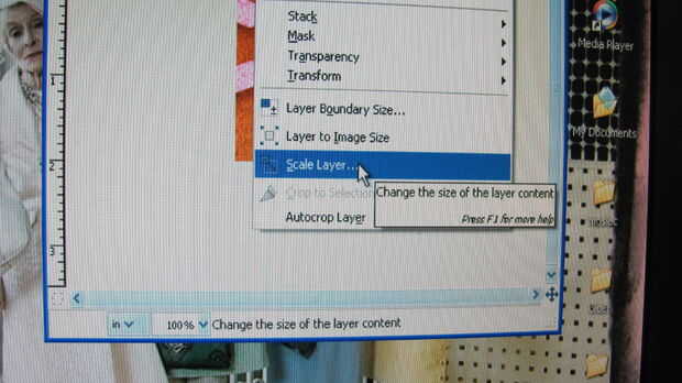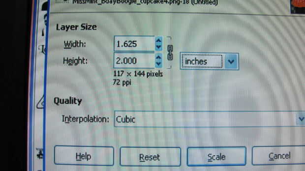 La Magdalena es mucho mayor que el cuadrado de 2 X 2, así que tuve que escalar la capa. Cuando inauguró la capa, lo único que pude ver fueron las chispitas en el Magdalena. En la parte superior bajo el chasquido de la etiqueta de "Capa" en capa de escala. Sé que la Plaza es 2 X 2, por lo que el lado más grande puede ser no mayor de 2 pulgadas. Como está cerrada la cerradura poco permanecerá en proporción. Haga clic en escala.