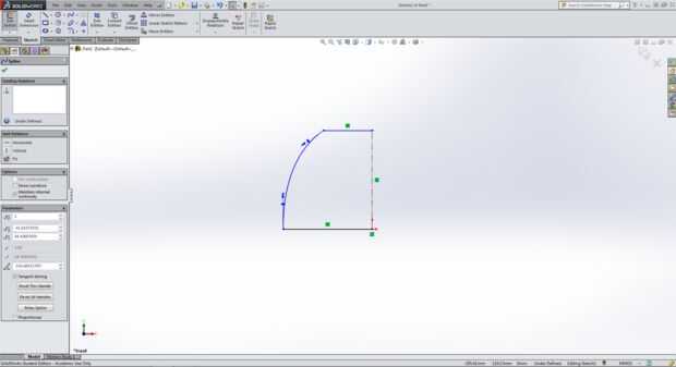 en este plano de que estará dibujando un cuarto de la tetera haciendo una esquina mediante la línea herramienta y cerrando estas 2 líneas con una tangente uno hecho con la herramienta spline.
