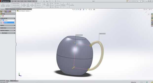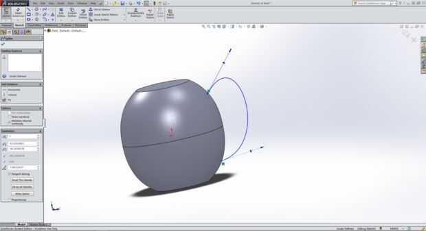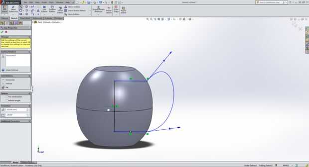 Para agregar la manija que vamos a utilizar la función de barrido. Esta función puede barrer una forma sobre una línea que se dibuja perpendicular en él, para la manija dibujó un círculo en el plano derecho, perpendicular en este círculo que dibujé la forma de la empuñadura (en el plano frontal).