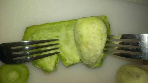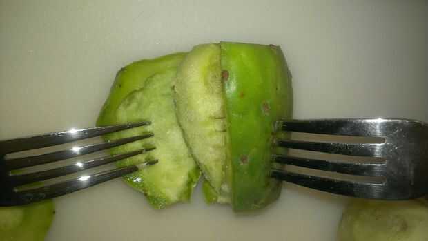 En este punto puede seguir Pele la fruta con las horquillas, o mantener la piel con un tenedor mientras usted saca el fruto con los dedos.