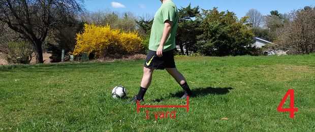 Estos pasos deben ser grandes pasos, aproximadamente una yarda de longitud, entre cada pie como se muestra en la figura 4, para acomodar para los más grandes pasos que se tomarán cuando el reproductor se está ejecutando a la bola. Una vez haya hecho la pelota y a ti mismo, deberás elegir que tipo de golpe usted realizará que determinará los pasos más que se llevará en el tiro libre. Esto le llevará a un rápido análisis de la situación: posición del tiro libre en el campo, la colocación de la pared humana y colocación de encargado de la meta.