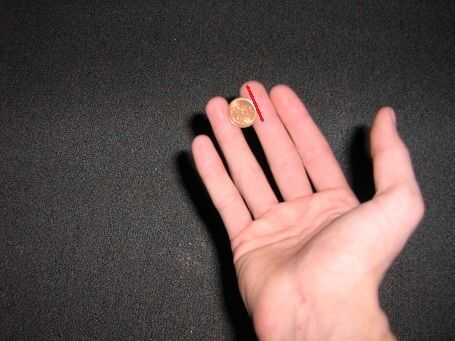 Coloque la moneda en su dedo medio, donde tengo la línea roja. Que es casi en el centro de mi dedo.